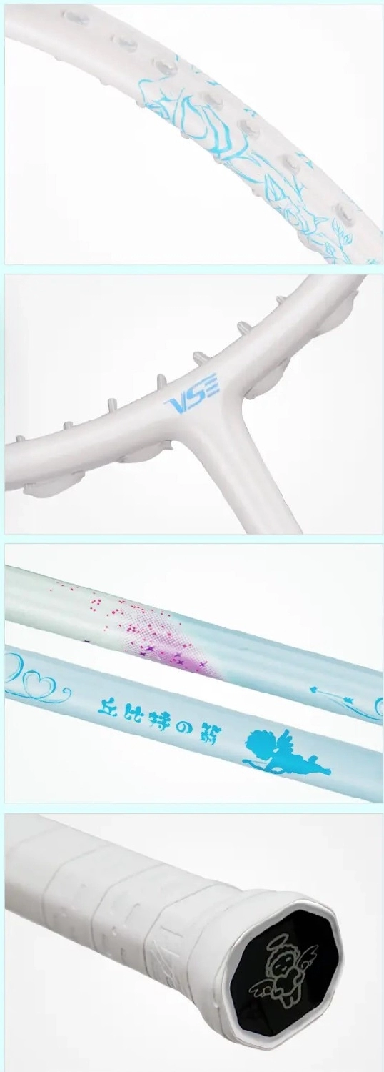 - VS Cupid có 2 phiên bản màu sắc khác nhau, đó là màu trắng hồng và màu trắng xanh. Với thiết kế đẹp mắt tạo ra một cây vợt trẻ trung, thanh lịch và không kém phần hiện đại phù hợp với những lông thủ muốn chọn cho mình một cây vợt mang màu sắc sáng, đặc biệt bản thiết kế phối màu này rất phù hợp cho các bạn nữ.