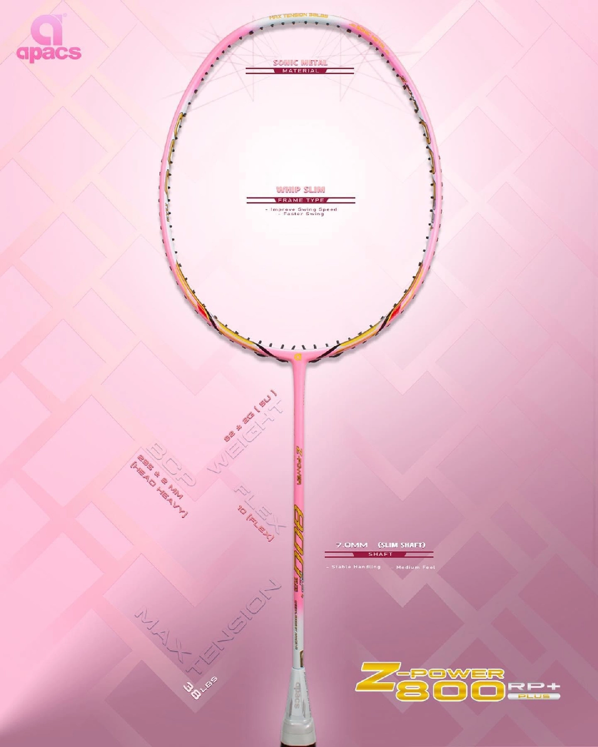 - SLIM SHAFT: Công nghệ đũa vợt siêu mỏng giúp cắt giảm lực cản không khí, tăng tốc độ đánh cây vợt cầu lông Apacs Z-Power 800 RP+ chính hãng